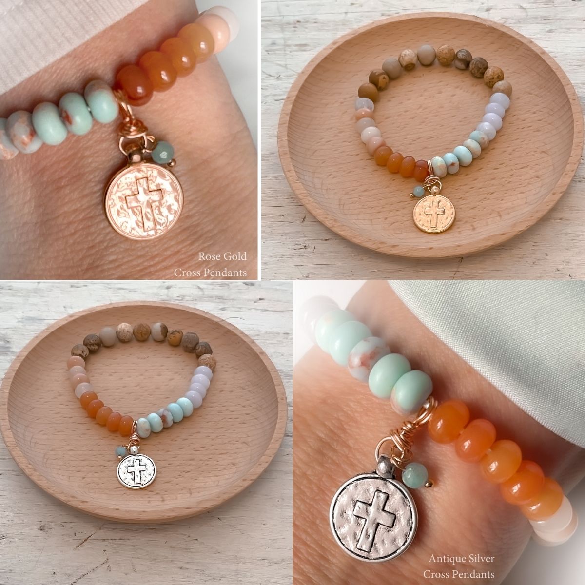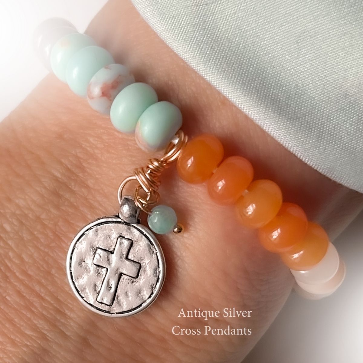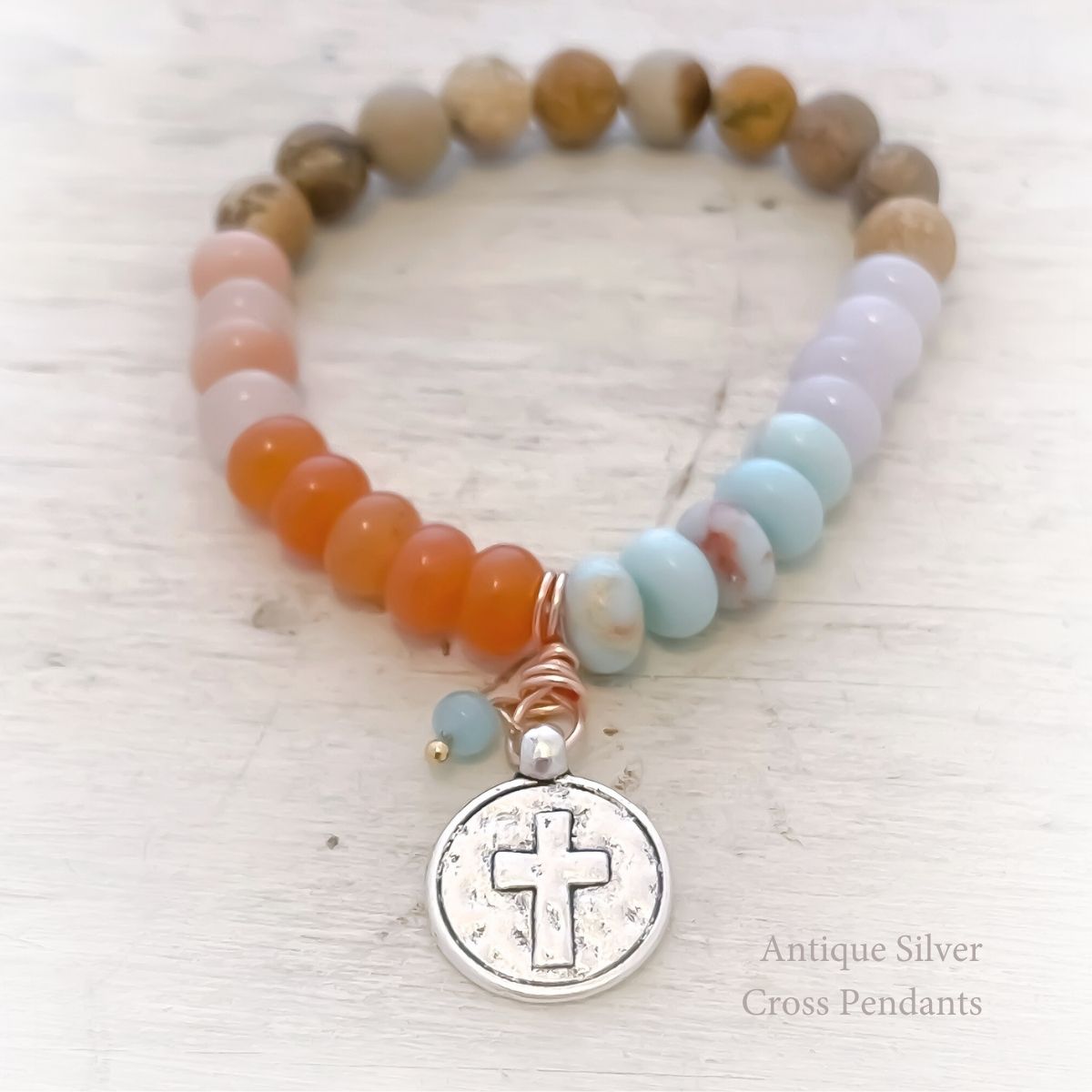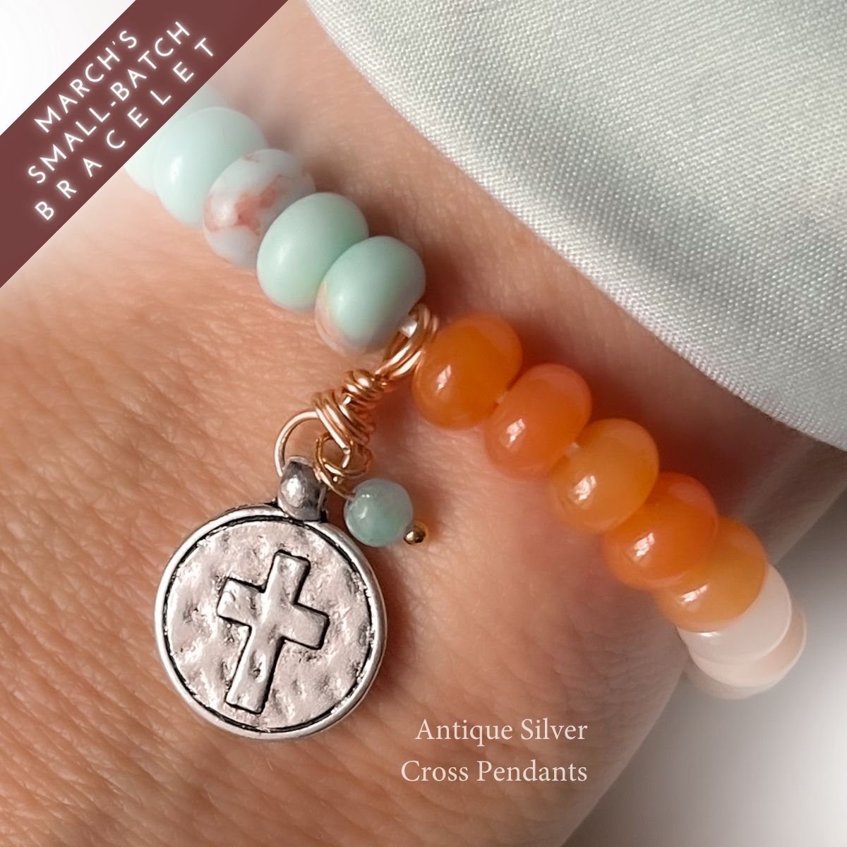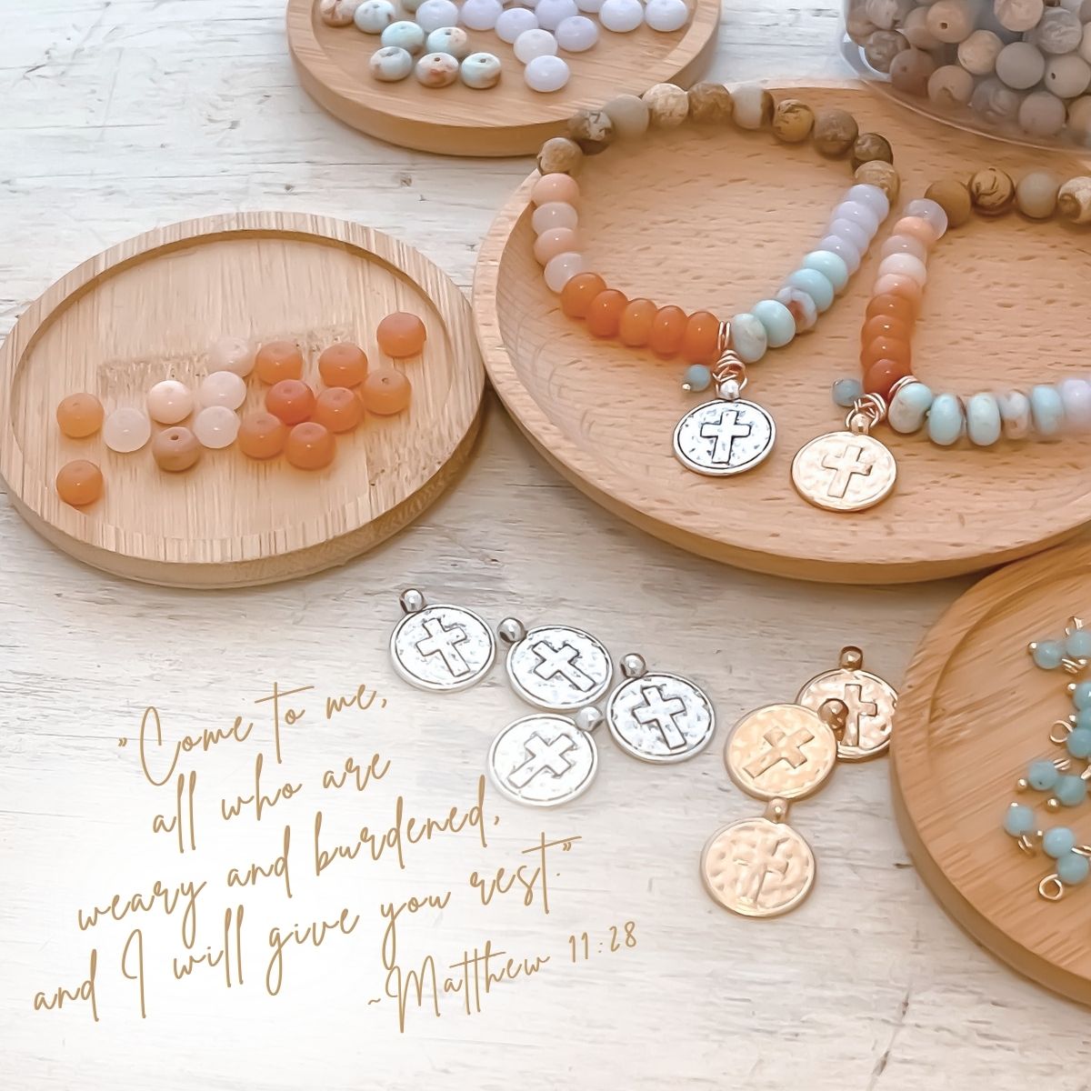 - Nearest the cross are three natural olive wood beads from the Holy Land—grounding this bracelet in the place where Jesus prayed in Gethsemane.