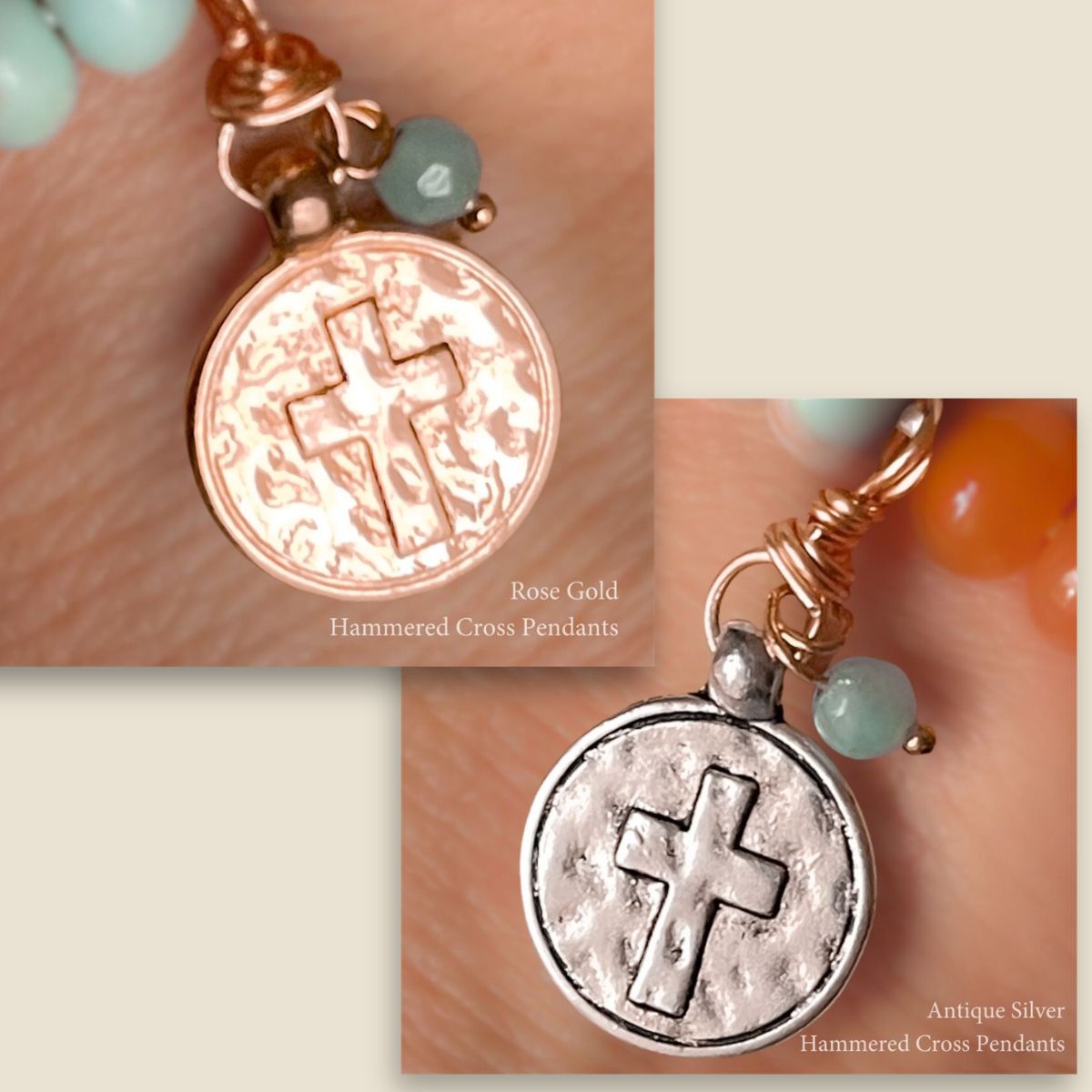 - Above the cross, lighter wood beads lift the eye—